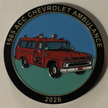 Fifth in a series! 1.75” diameter 2026 PCS Challenge Coin featuring the 1965 ACC Chevrolet Ambulance
