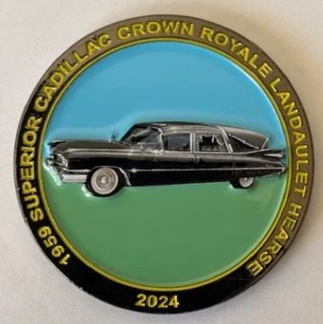 Third in series 1.75” diameter 2024 PCS Challenge Coin featuring the 1959 Superior Cadillac Crown Royale Landaulet Hearse